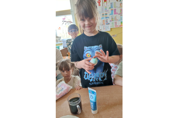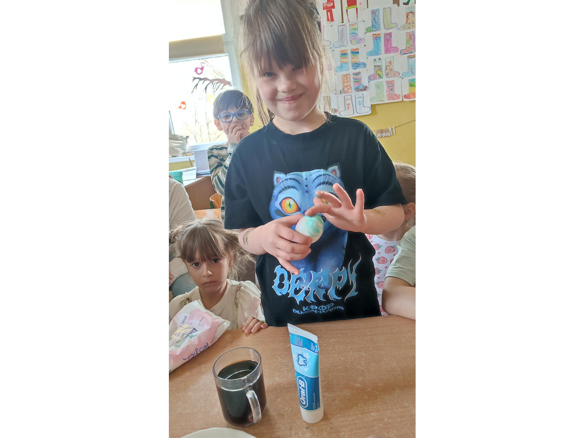 - Jajko w coca coli (pokazanie jak pasta czyści i chroni nasze zęby, a jak coca cola je niszczy)
